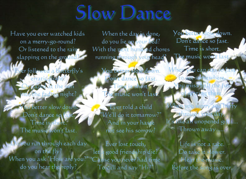I want everyone to know how happy I am. I never knew what it felt like to really be in love. New look, new Love, it's great. God put Christy and I together for a reason. We don't know what it is yet, and maybe we never will. That's ok. We are tied together with a force stronger than either of us. We both struggle through life's little problems but we have each other to lean on and talk to. For both of us this is very new. We no longer have to figure out things on our own. The reduced stress even has my hair growing back (with no external chemical help). We like to do the same things, watch the same movies, eat the same food, and it is uncanny how sometimes I just know what she wants or what she is going to talk about. It is amazing how in tune we are with each other. There isn't a day when we don't giggle (and Courtney always asks "what's so funny"). The children are amazed at how we do the same things, even our friends notice it. Courtney and Chelsey love her, and Marty and Dakota are great brothers for the girls. I feel like a kid again. My life is so different, on a summer weekend we went to a walking trail waded in a stream with the kids and eventually sat down in the water and made butt prints on the concrete. What a blast!!! What good is life if you can't enjoy the little things. We have a special poem we found and it talks to us both.